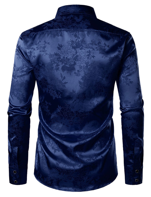Julian | Blauw satijnen herenoverhemd met bloemenjacquard
